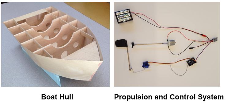 The Goal of this project is to build a remote-controlled fireboat that delivers water to targets. The water is delivered by a pressurized 2L beverage bottle (not shown in the figures), partially filled with water, carried by the boat. My key contributions in this five people team are optimizing the pressure system to deliver as much water as possible, leading the team to meet milestones, and collaborating with other sub-teams to develop MATLAB simulations for performance prediction.